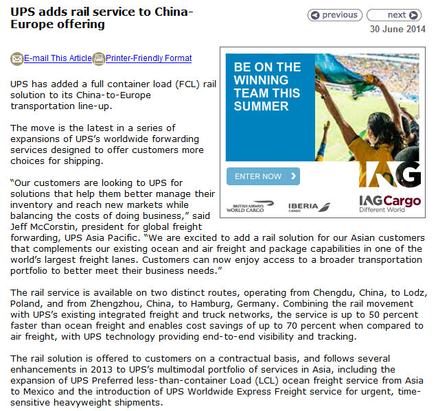跌路運輸服務(wù)現(xiàn)服務(wù)于兩條線路:中國成都市--波蘭洛茲市,中國鄭州市--德國漢堡市。鐵路運輸還將結(jié)合ups現(xiàn)有的綜合運輸系統(tǒng)及其汽車交通