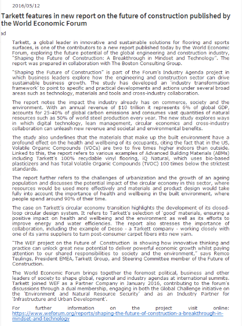 世界經濟論壇發布得嘉對未來建設的特別報告 ![]() 得嘉, 是創新和可持續發展解決方案的全球地板和運動表面領導者,在2016年世界經濟論壇與波士頓咨詢集團(Boston Consulting Group)合作貢獻一份報告:探索未來全球工程和建筑行業的潛力,“塑造未來的建筑:心態和技術突破”。 “塑造未來的建設”是行業論壇議程的一部分,商業領袖探索工程和建筑業如何推動可持續業務增長。研究開發了一個“產業轉型框架”指具體和實際發展和行動等廣泛領域技術、材料和工具和跨行業合作。 報告指出建筑業已經對商業的影響,社會和環境問題。年營收為10萬億美元,占全球國內生產總值(GDP)的6%,占全球碳排放的25 - 40%,消耗大量的自然資源,如每年全球鋼鐵產量的50%。新的研究探索的方法數字技術,精益管理、循環經濟和跨行業合作可以帶來新的收入,社會和環境效益。 研究表明材料是構成建筑環境產生的深遠影響居住者的健康和福祉,并引用事實,在美國揮發性有機化合物(揮發性VOC)在室內比外面高2 - 5倍。報告指的是各種先進的建筑材料(ABMs)的例子,其中包括得嘉是100%可回收的iQ天然塑料地板,使用生物增塑劑和總揮發性有機化合物(TVOC)低于最嚴格的標準的100倍。 報告進一步指出城市化和人口老齡化對發展的挑戰,探討了循環經濟的潛在影響,資源需要更有效地使用,材料和產品設計需要充分考慮建筑環境健康的重要性,因為人們在建筑空間花的時間為90%左右。 得嘉分享循環經濟轉型凸顯其閉環循環設計系統的開發案例。它指得嘉選擇“好”材料,確保健康和環境產生積極的影響,以及努力提高能源和用水的效率。報告還強調了合作的重要性,包括Desso—得嘉公司的例子—密切與紗線供應商的合作,將使用后的地毯纖維轉化為新的紗線。 世界經濟論壇對未來建設創新思維和實踐可以解鎖創新的偉大潛力課題,提供強大的經濟增長的同時也關注我們社會和環境的責任,Remco Teulings話,EMEA得嘉集團總裁及未來建設指導委員會成員。 世界經濟論壇匯集了最重要的政治、商業和其他社會的領導人,塑造全球、區域和行業在國際會議的議程。得嘉在2016年1月加入世界經濟論壇作為合作伙伴,以雙重會員的身份參與兩個論壇的討論:全球挑戰計劃對環境和自然資源安全以及一個行業合作伙伴的基礎設施和城市發展。